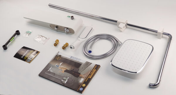 Bộ sản phẩm bao gồm : 1 thân củ sen, 2 ống dẫn cây sen, 1 đài sen lớn, 1 tay sen, 1 dây sen 150cm, 1 bát trượt tay sen, 1 bát gắn đỡ ống cây sen ( kèm tackle, ốc vít), 2 chân quỳ, 2 nắp chụp Inox, 2 roong cao su cho chân quỳ và 1 roong cao su cho khớp nối ống sen, 1 sách hưỡng dẫn sử dụng kèm phiếu bảo hành.