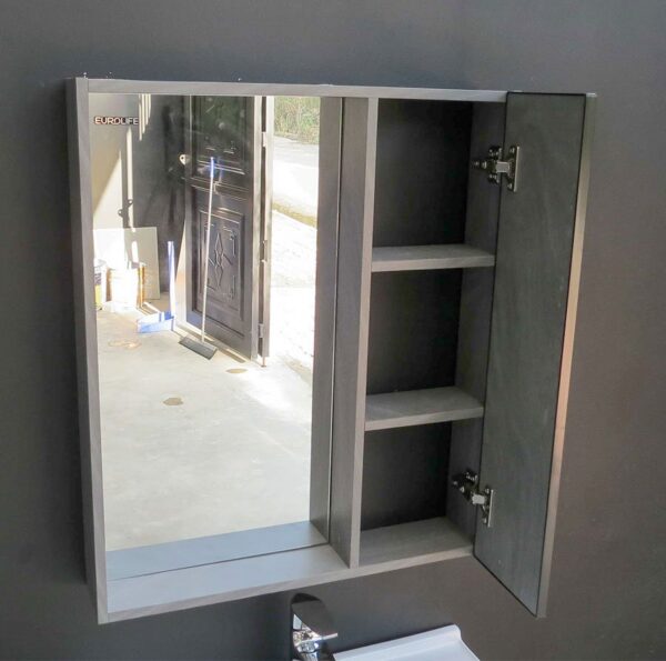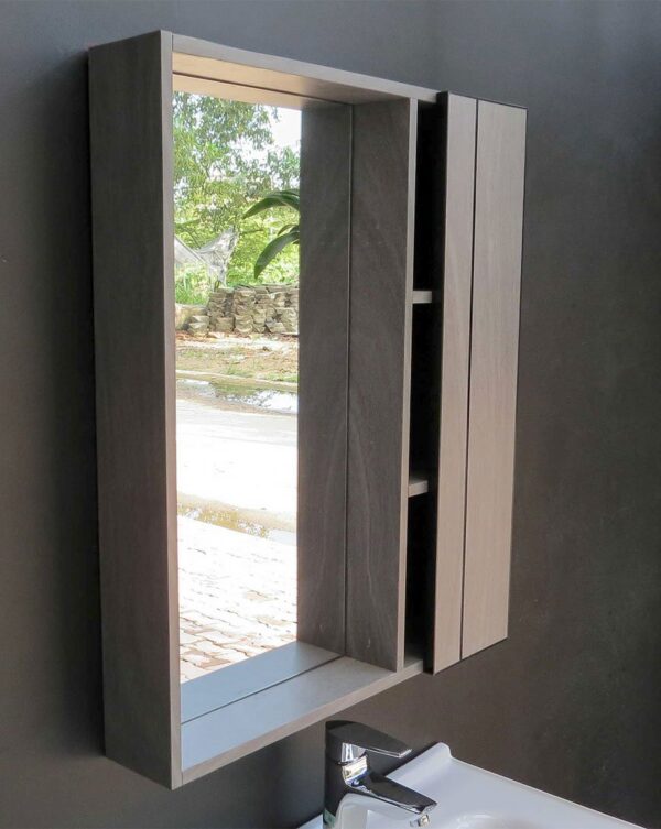 Tủ gương được thiết kế đơn giản với kích thước 600x700x125mm. Kết hợp với một hộc nhỏ có cánh bên phải, để các vật dụng cần thiết sử dụng hàng ngày