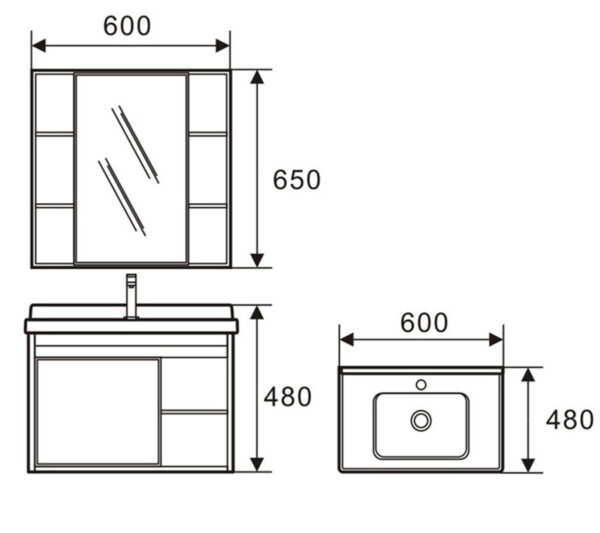 * Kích thước : Thân tủ Lavabo 600x480x480mm. Tủ gương : 600x650x125mm