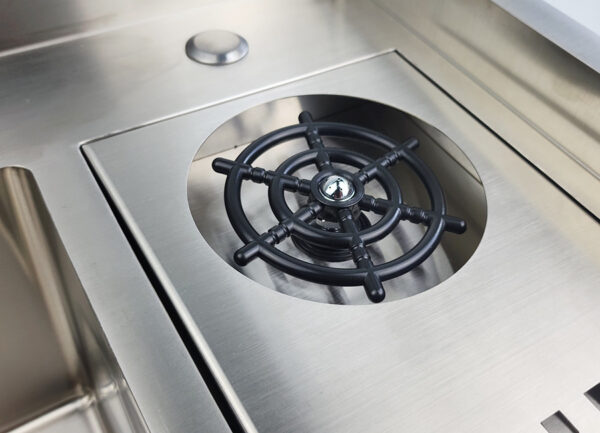 Chậu được tích hợp một lỗ chờ cho việc gắn bình xịt nước rửa chén, hoặc có thể dùng để lắp vòi nước tinh khiết.