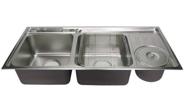 Hộc lớn với thiết kế rộng rãi để rửa ráy những vật dụng lớn, tạo sự thoải mái khi sử dụng. Chậu được tích hợp các tiện ích như : Hố rác nhỏ 20cm, bộ cài dao và lỗ gắn bình nước rửa chén.