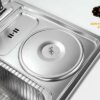 Bộ xả đi kèm với 2 rốn lọc bằng Inox SUS 304 với lọc chặn rác được làm bằng inox 304, sắc nét. Kích thước 110mm cho hộc nhỏ và 140mm hộc lớn, giúp thoát nước nhanh chóng. Bộ xả có đủ dây thoat nước cho hố rác nhỏ.