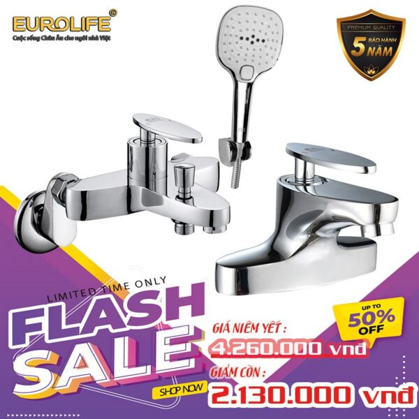 COMBO Bộ vòi sen nóng lạnh Đồng mạ Chrome EL-CAM 01 (Trắng bạc) + Vòi lavabo nóng lạnh 2 chân EL-CAM03 Eurolife COMBO EL-CAM0103