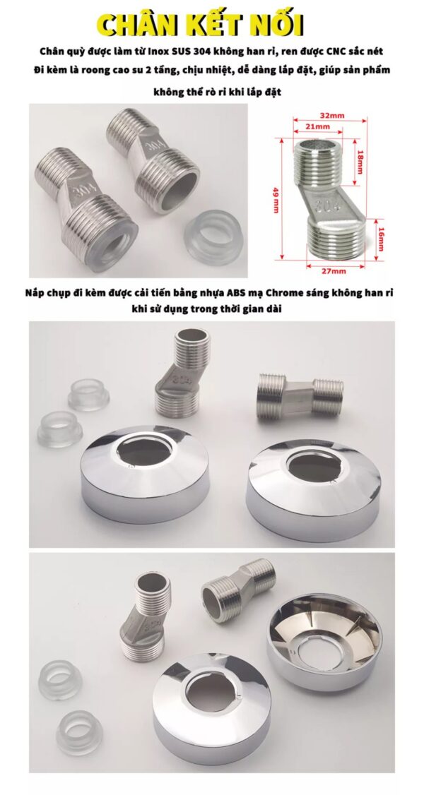Ốc kết nối bằng đồng, kết hợp với ốc đai bằng Inox 304 giúp sản phẩm cứng cáp khi lắp đặt, không bị gãy vỡ sau thời gian sử dụng