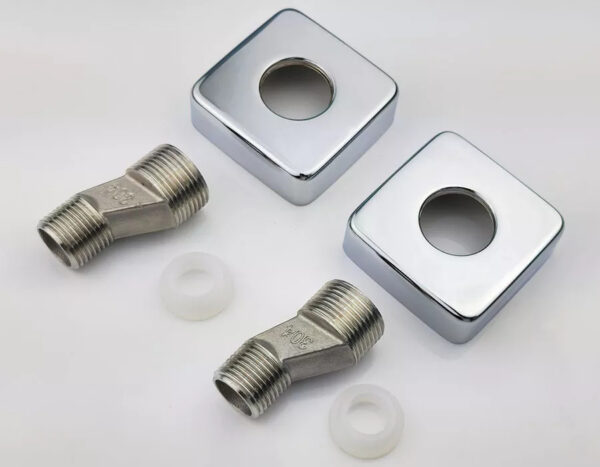 Chân quỳ được đúc từ Inox SUS 304 và CNC sắc nét, bền bỉ, dễ lắp đặt. Đi kèm là 2 bát che bằng Inox mạ Chrome đồng bộ với màu thân vòi, 2 roong cao su 2 tầng chịu nhiệt