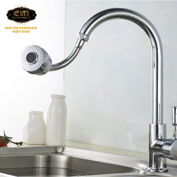 Đầu vòi được thiết kế với cần lò xo dài, có thể uốn cong, điều hướng dòng chảy dễ dàng và linh động