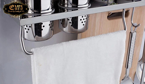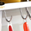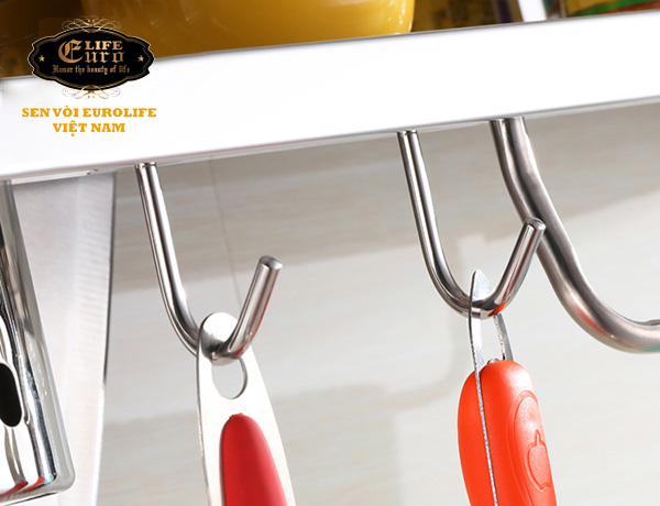 Kệ được thiết kế với các móc treo, có thể treo thớt, muỗng, vá, cùng đồ dùng nhà bếp vô cùng tiện lợi.