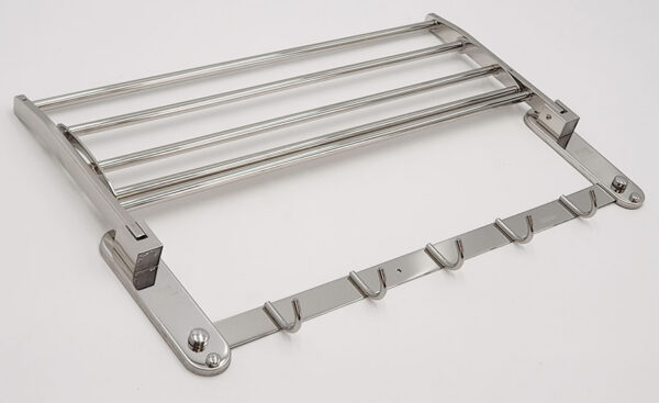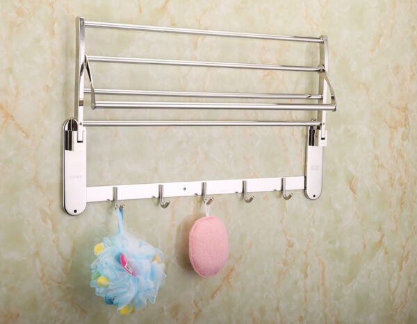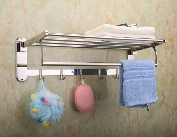 Kệ được thiết kế đang năng linh động với 1 máng đẻ khăn, 1 máng treo phơi khăn tắm và 5 móc treo đồ, thuận tiên khi sử dụng