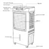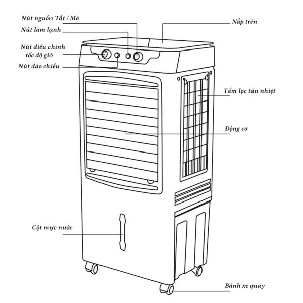 Két nước dưới được thiết kế lớn với dung tích 50 lít, giúp quạt sử dụng lâu hơn và làm mát liên tục. Cột theo dõi mực nước nằm phía trước dễ quan sát và theo dõi mực nước trong bình.