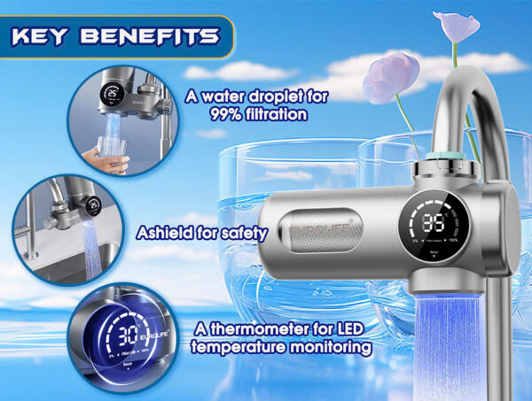 ✔️ Màn hình LED hiển thị nhiệt độ nước và tuổi thọ của lõi lọc theo thời gian thực, giúp bạn dễ dàng nhận biết khi nào mình cần thay thế lõi lọc. Tính năng thân thiện với người dùng này đảm bảo duy trì tối ưu chất lượng nước.