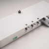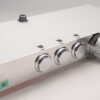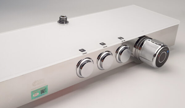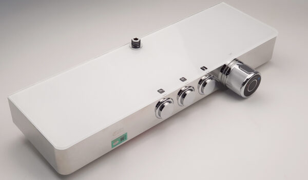 Tay mở nguồn được thiết kế hiện đại, xoay phải hoặc trái để điều chỉnh việc pha trộn nước nóng hoặc lạnh. Mặt kính cường lực màu trắng bên trên giúp sản phẩm sang trọng hơn