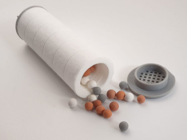 Bên trong lớp PP là các hạt tạo Vitamin- khoáng chất. Tạo Ion âm cho nguồn nước, bổ xung vitamin và khoáng chất. Ngoài ra nó có tác dụng ngăn cản các vi sinh vật, bào tử và loại bỏ màu, chất hữu cơ (trong nguồn nước tự nhiên thường xuất hiện các chất tiết ra từ vỏ cây, các chất mùn, bùn, gỉ sắt các độc tố và vi khuẩn có hại…)