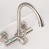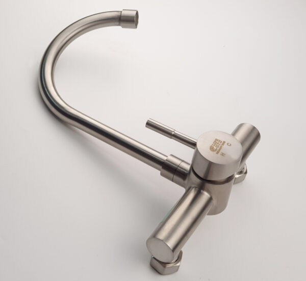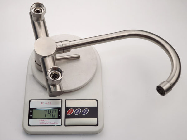 Thân vòi được thiết kế với thân tròn, cần quay linh động. Góc quay rộng, phù hợp cho chậu 2 hố.