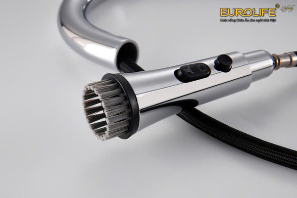 Đầu vòi được tích hợp thêm 1 vòng bàn chải lông, có thể gắn liền và tháo rời một cách dễ dàng. Thuận tiện cho việc rửa chén đĩa và các vật dụng nhà bếp.