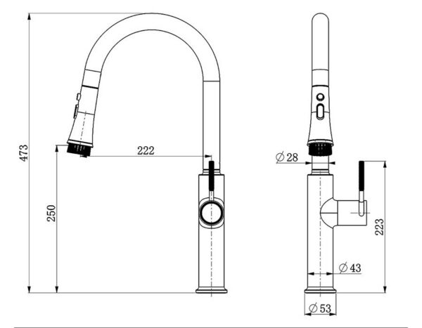Ống tròn lớn chuốt cao theo thân vòi. Vòi cao tới 473mm, phù hợp với bếp lớn, với dòng chảy mạnh mẽ
