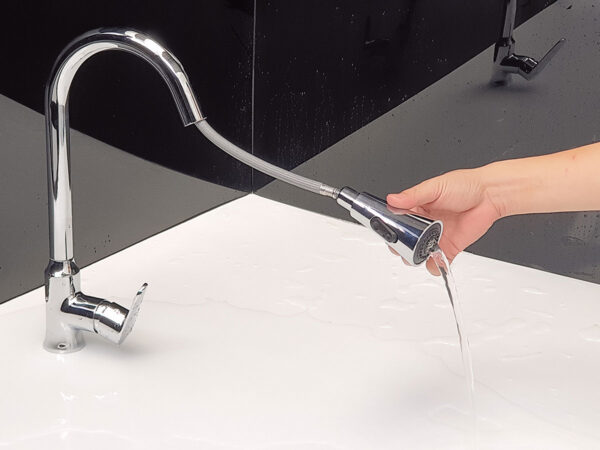 * Đầu vòi có thể kéo ra ngoài, đầu vòi với 2 chế độ chảy tăng áp và thông thường